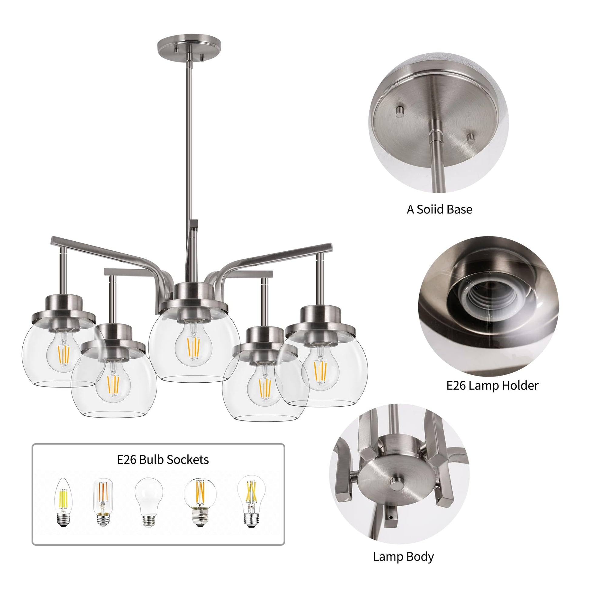 Elevate your home with the sleek sophistication of our Brushed Nickel 5-Light Chandelier. Designed with oversized clear glass globes and a refined brushed nickel finish, this fixture blends seamlessly into modern, transitional, or farmhouse interiors.