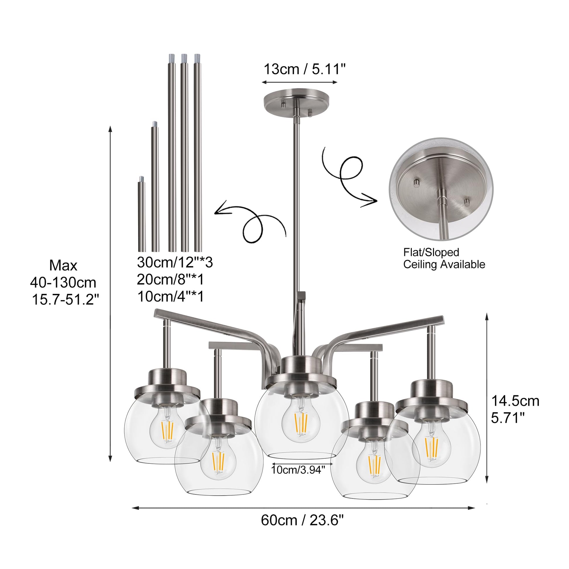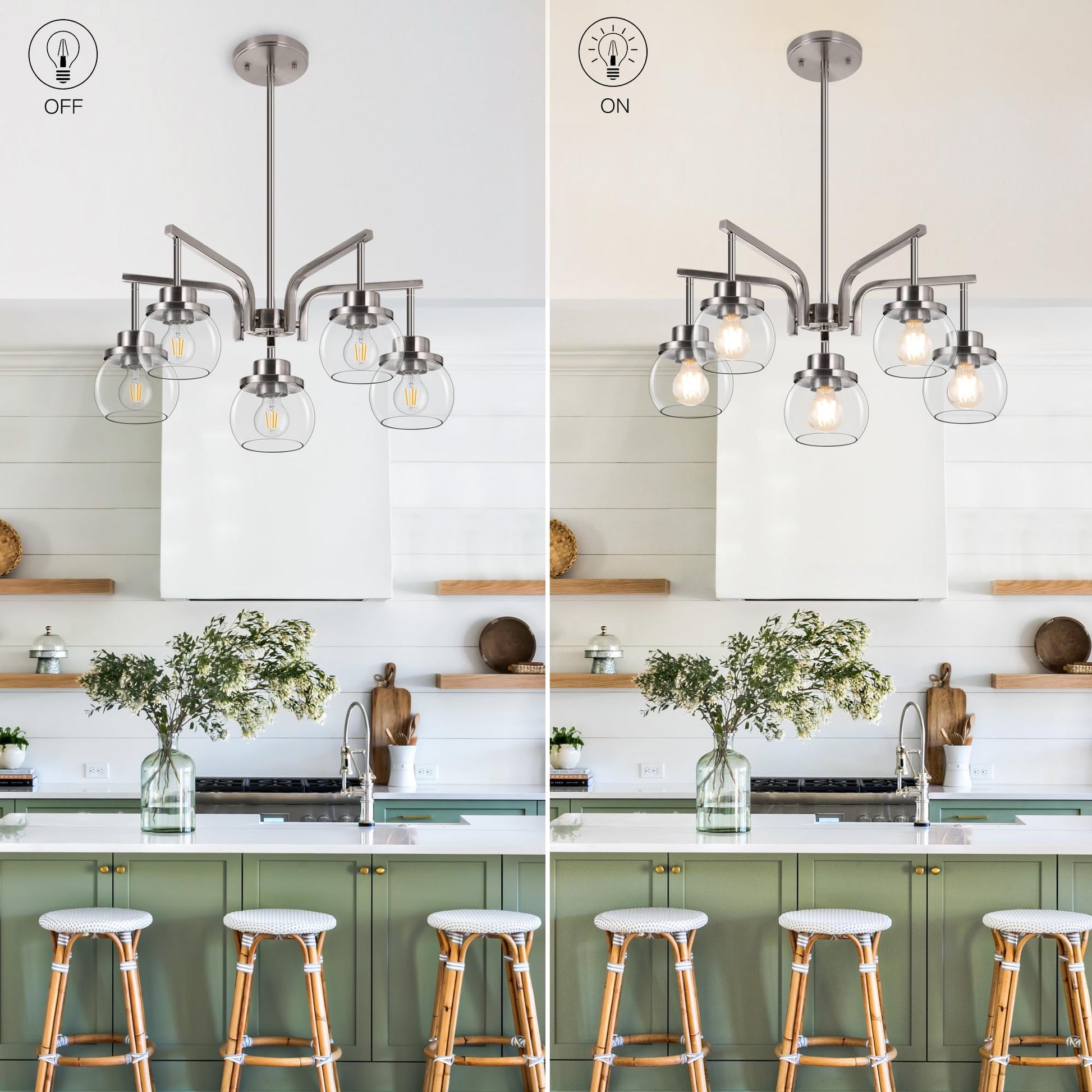 Brushed Nickel 5-Light Chandelier with Clear Glass Globes – Modern Dining Room & Kitchen Ceiling Light Fixture